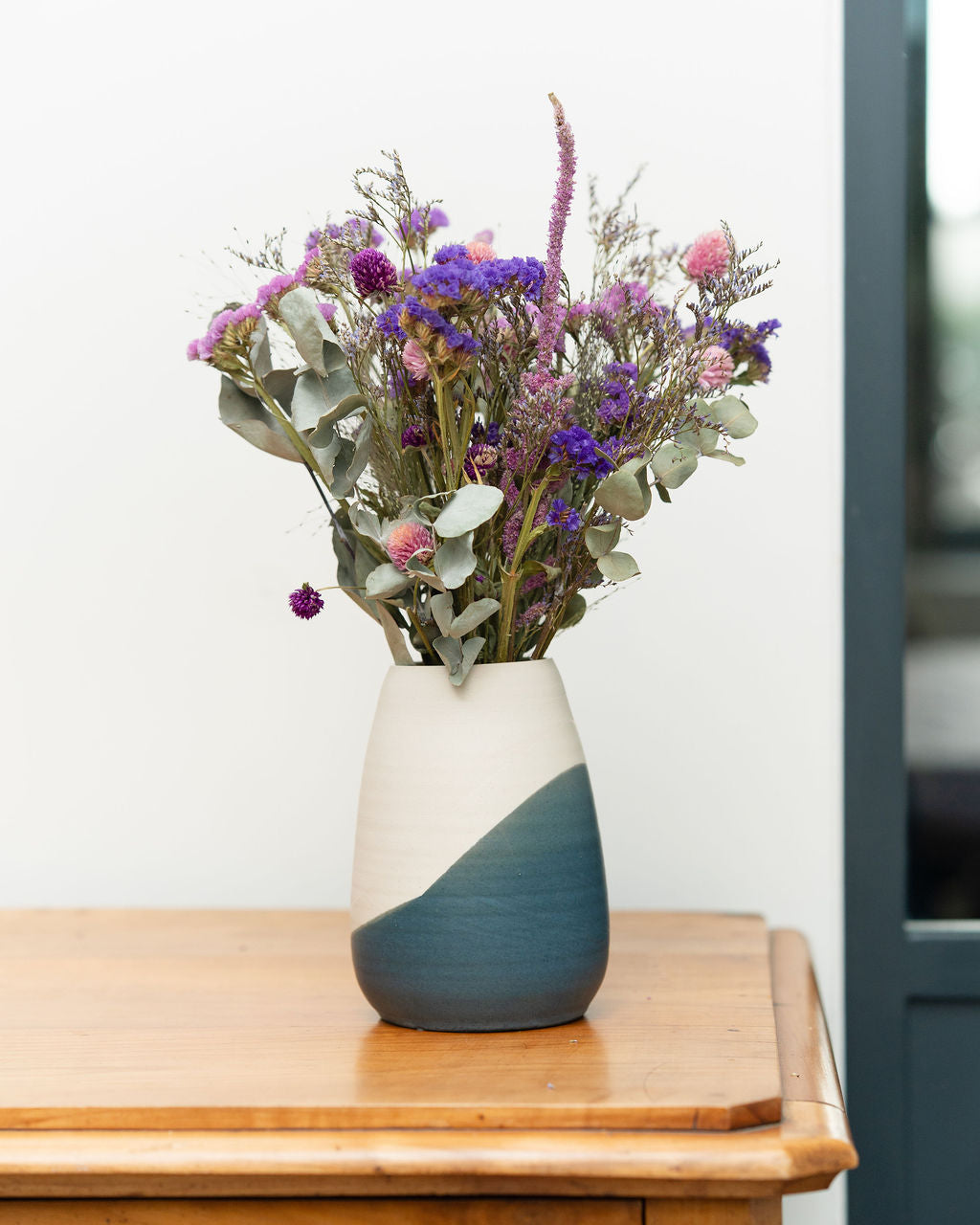 Composé de statice, gomphrena, eucalyptus et limonium, il apporte caractère et profondeur à votre intérieur.