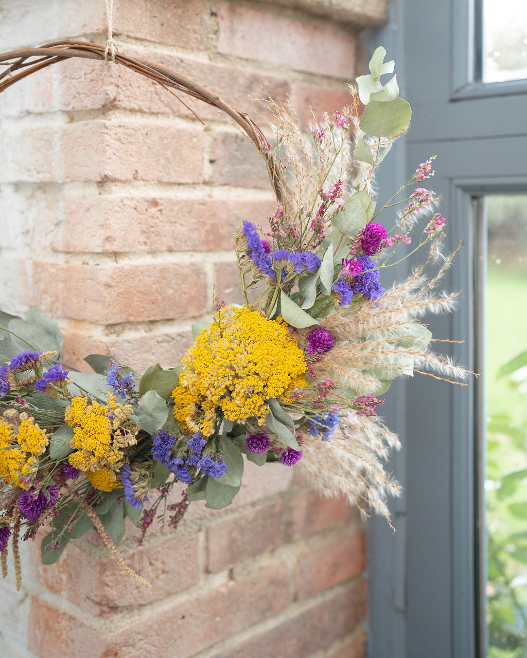 🌈 Dans la couronne aux couleurs vives vous retrouverez des teintes intenses et lumineuses, dans des fleurs comme la statice, le gomphrena, les immortelles, le limonium...