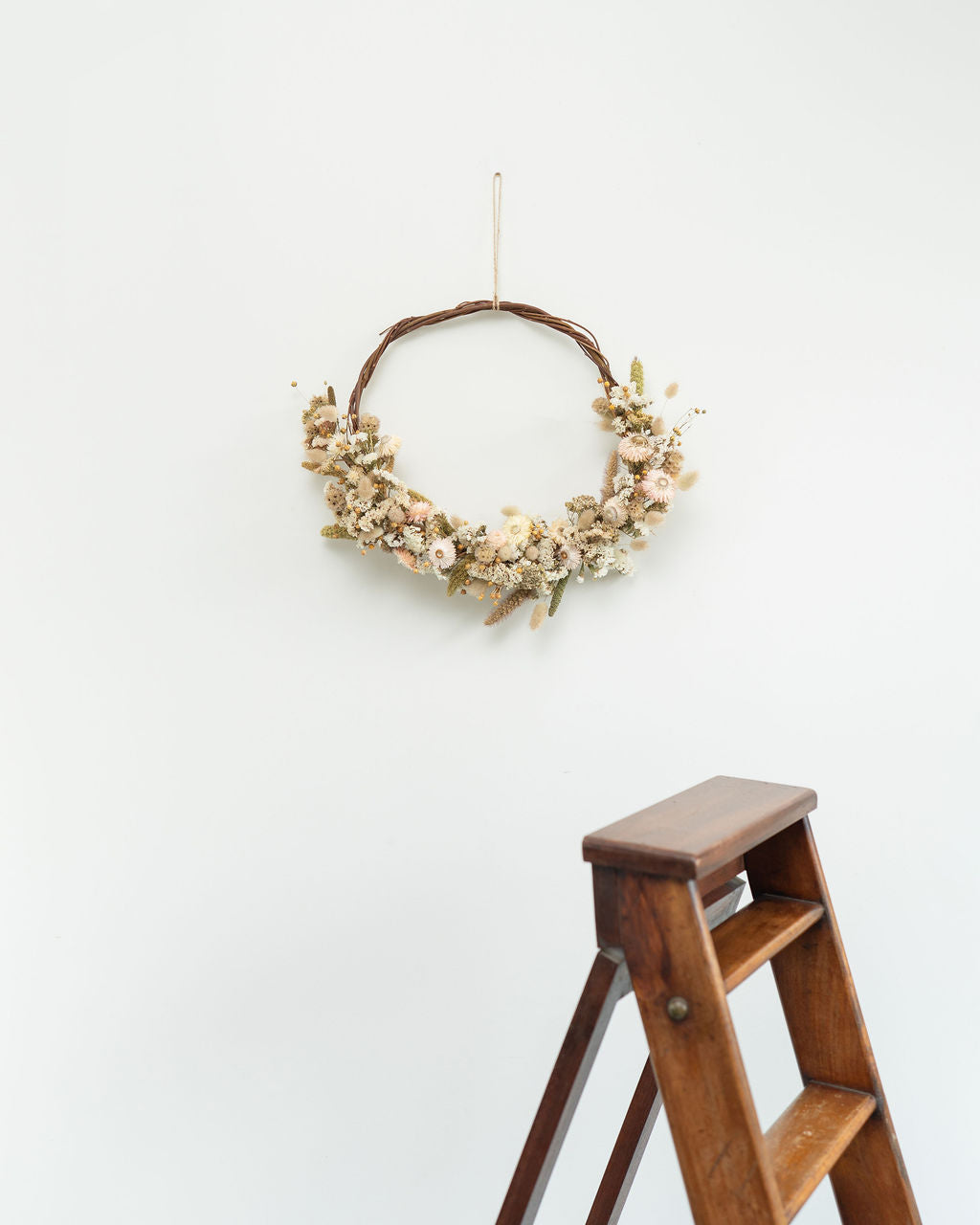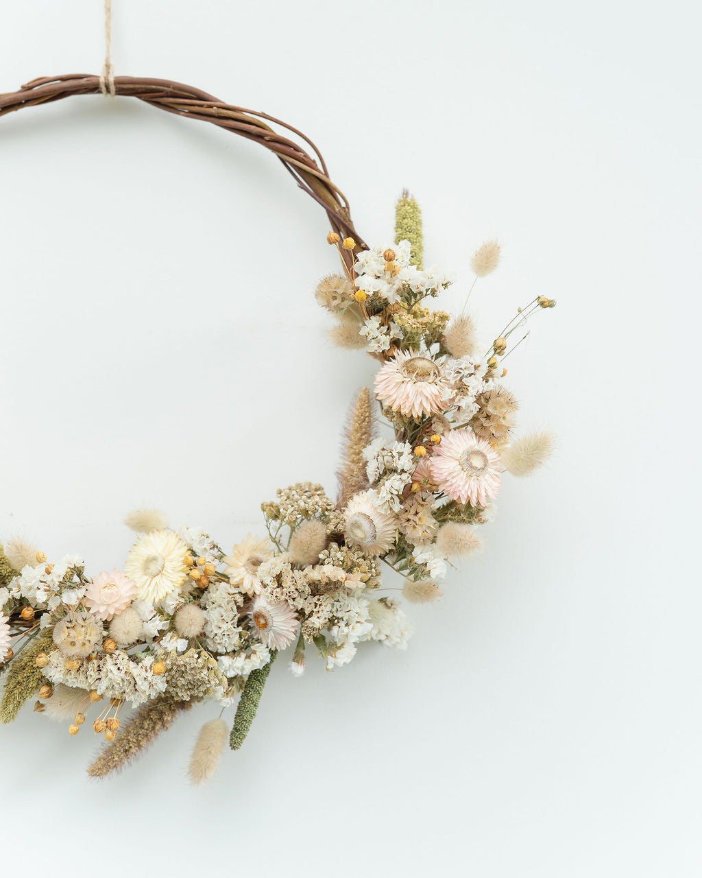 🧚🏻‍♀️ Dans la couronne aux couleurs douces nous avons sélectionné des teintes pastel comme la couleur peche ou rose pale. Immortelles, statices pastel, gypsophile, limonium ou panicum seront au rendez vous.